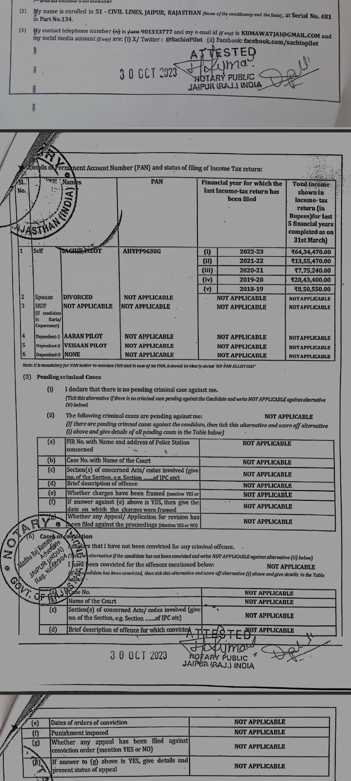 The affidavit also shows that Pilot’s wealth has almost doubled in the last five years. In 2018, his total assets were valued at approximately Rs 3.8 crore. By 2023, that had risen to reach an estimated value of Rs 7.5 crore.