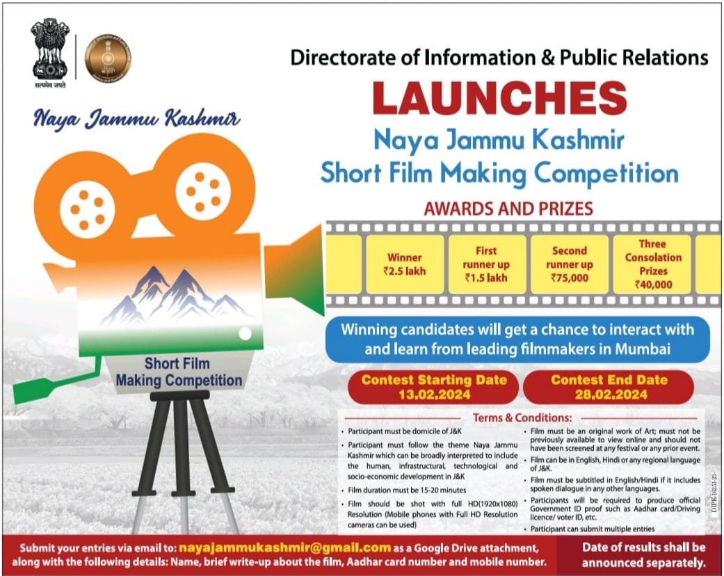 Aimed at nation-building development in Jammu and Kashmir, the Department of Information and Public Relations, DIPR J&K has announced awards and prizes for filmmakers for making short films on the theme of Naya Kashmir. The best films would be awarded with handsome cash prizes.