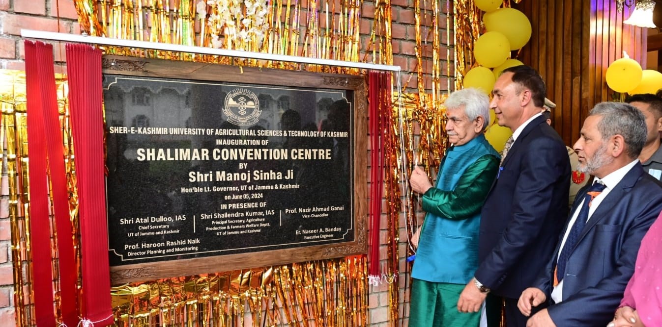 SRINAGAR, JUNE 05: Lieutenant Governor Manoj Sinha inaugurated key infrastructure projects at SKUAST Kashmir, including the Shalimar Convention Centre, Kohimaran Hostel, and Discovery Building. He launched new academic programs aimed at securing the future of the 70% population dependent on agriculture and allied sectors.