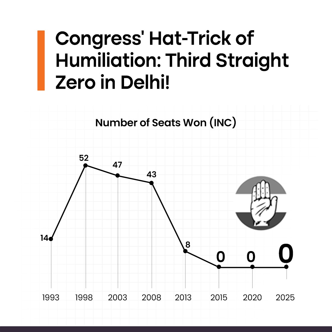 The Congress Party failed to win a single seat for the third consecutive time, marking a hat-trick of electoral failures. The grand old party, once dominant in Delhi, has been completely sidelined.