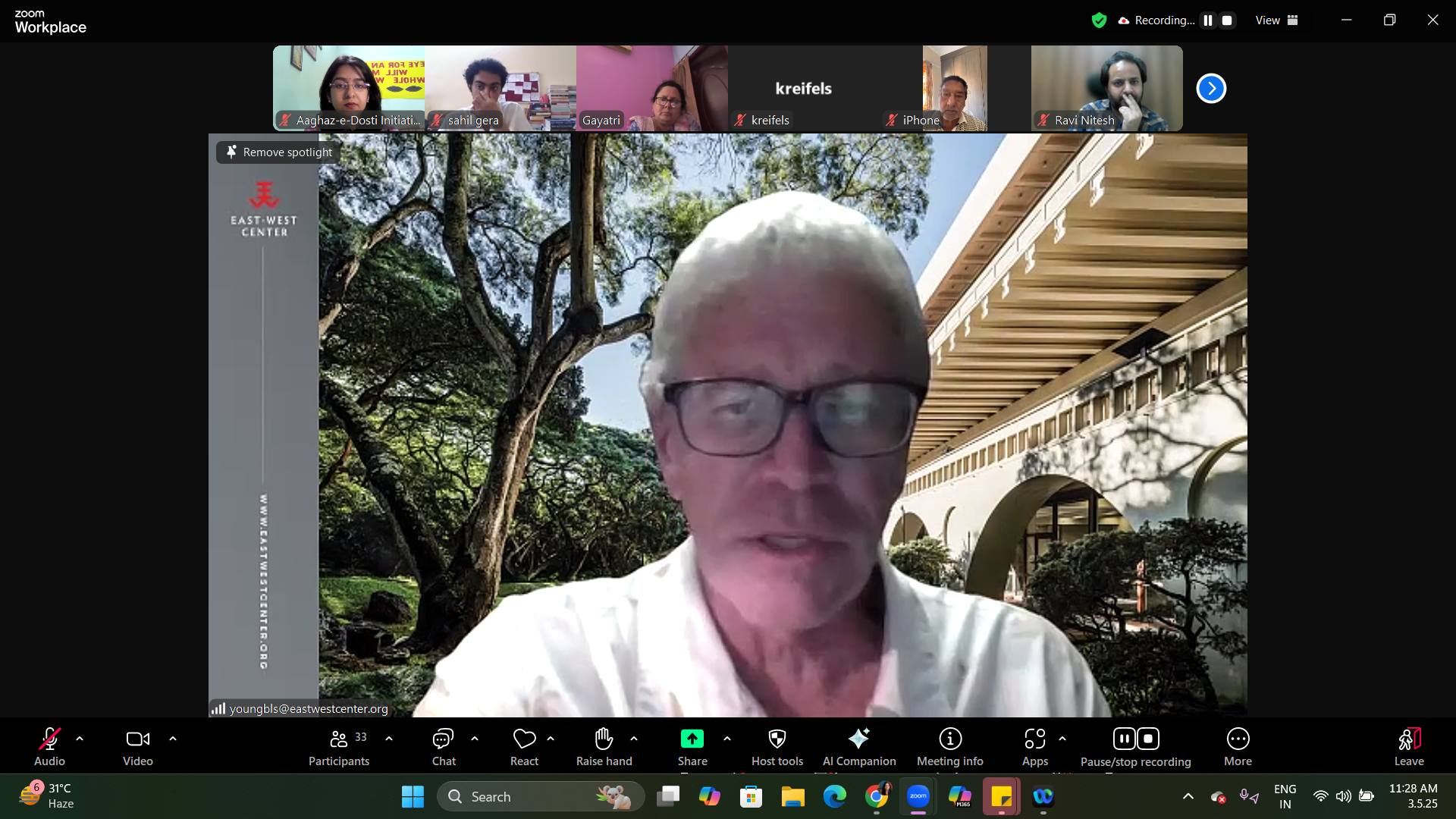 The lecture drew a diverse audience including peace activists, journalists, academics, students, and members of civil society. Notable attendees included Ela Gandhi (granddaughter of Mahatma Gandhi), activist Dipak Dholakia, Ms. Susan Kreifels from the East-West Center, Fr Cedric Prakash (Jesuit Catholic Priest and peace advocate), and Bilal Bashir Bhat, editor of Srinagar Jang, among others.